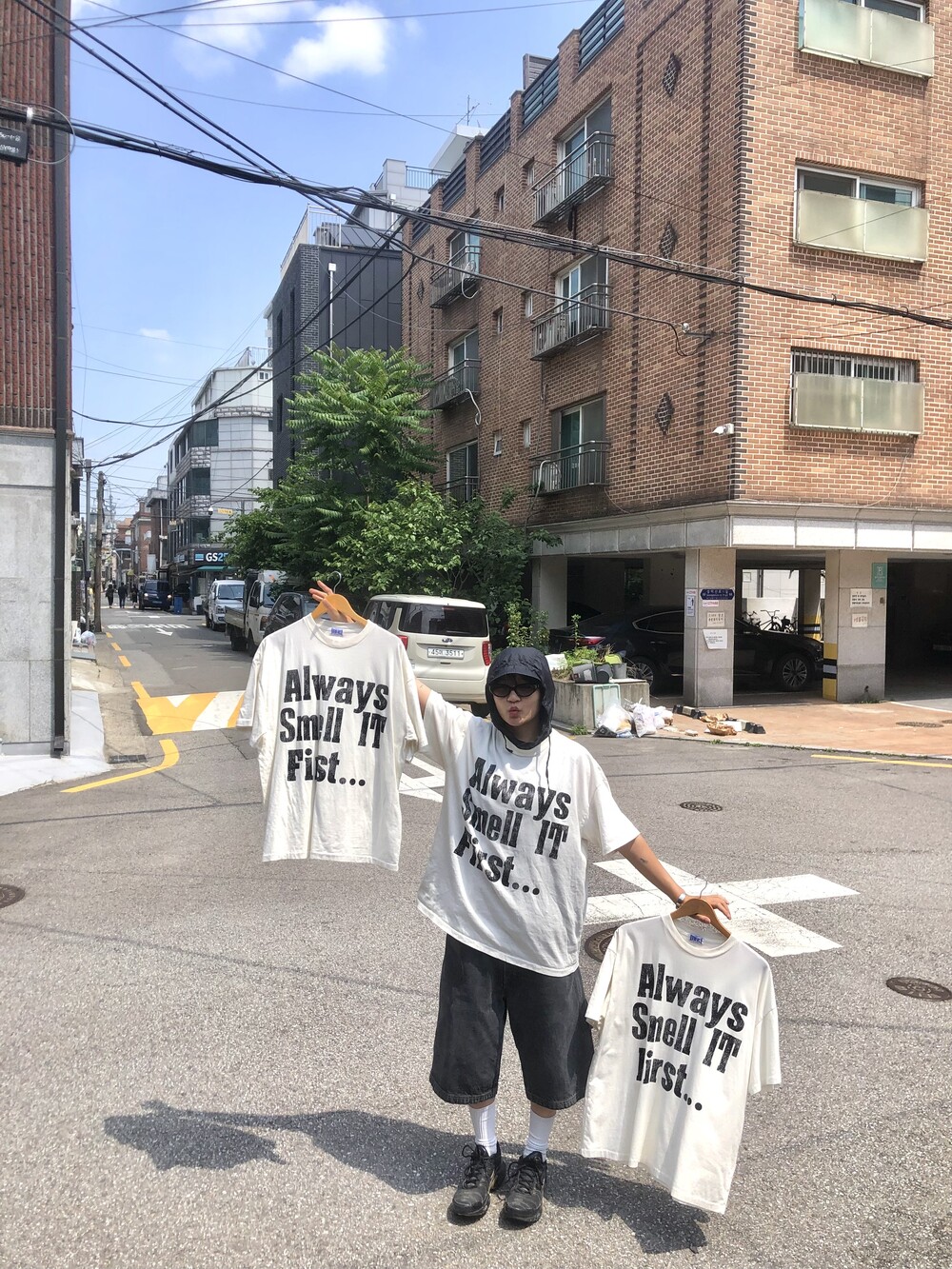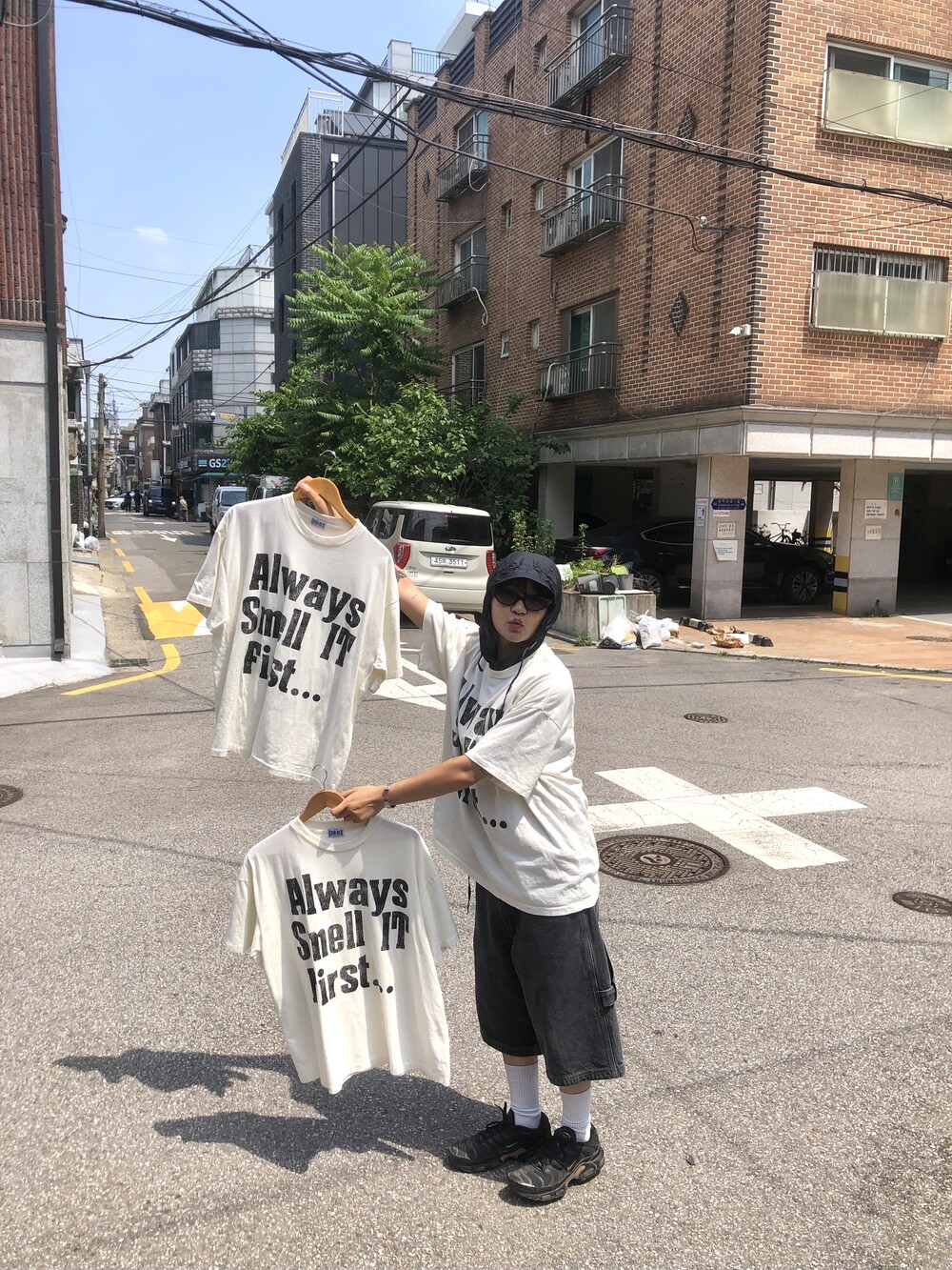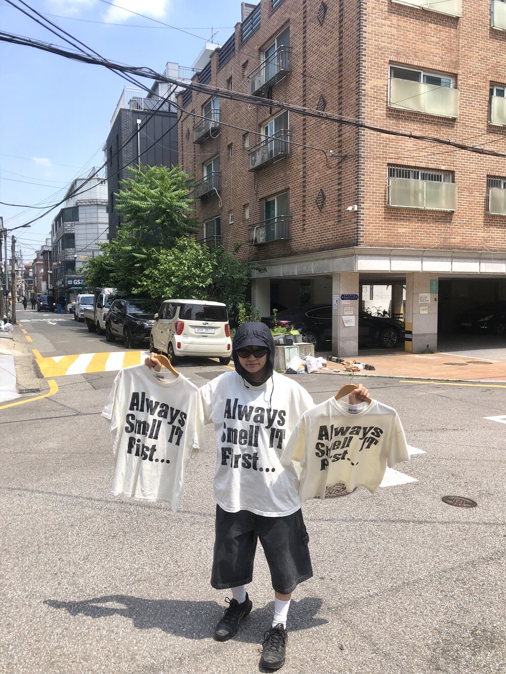 싱글스티치 처리(사진의 티셔츠는 샘플이라 더블이지만 완성본은 싱글스티치) 박시하고 짧뚱한 귀여운 핏의