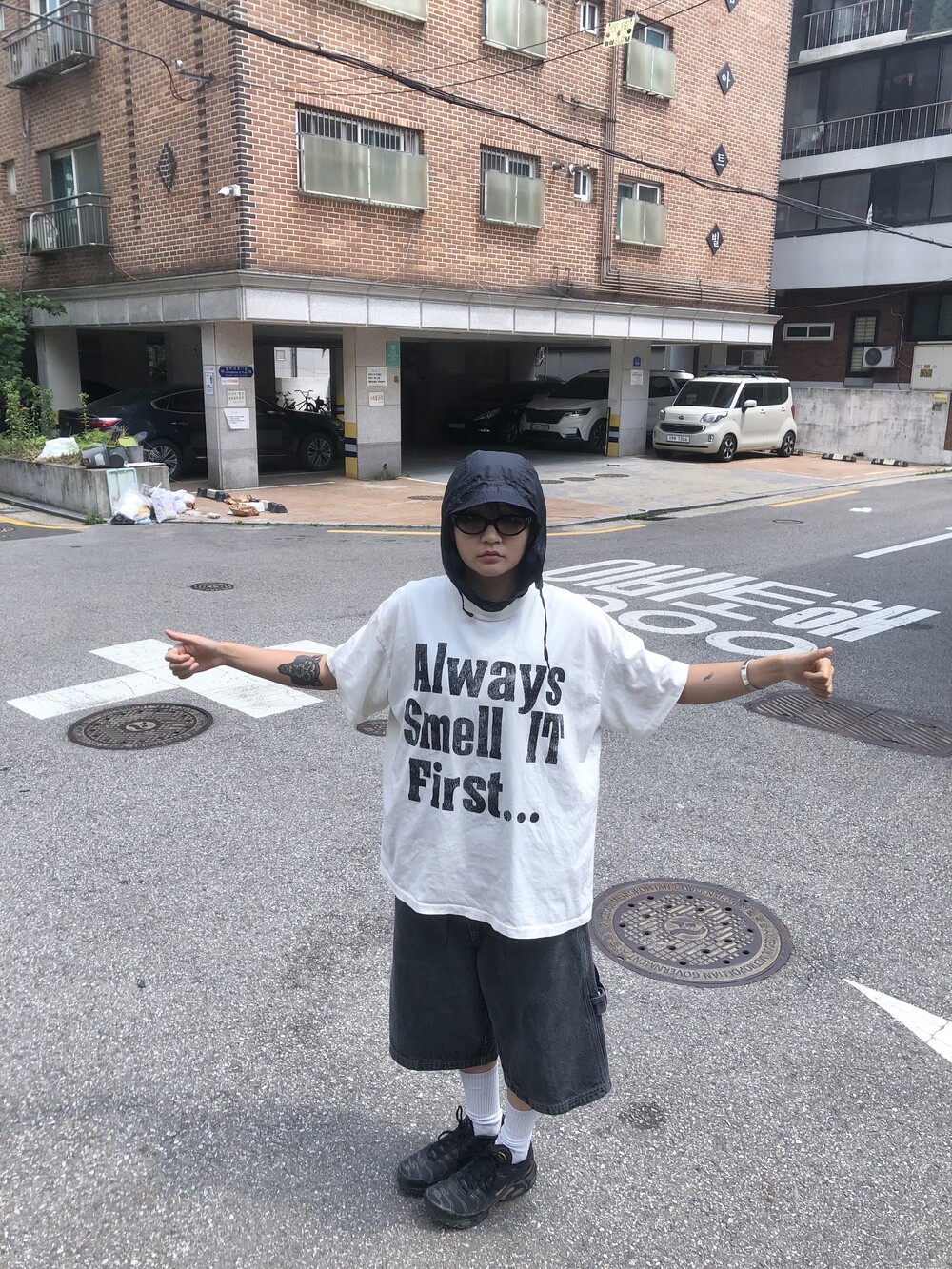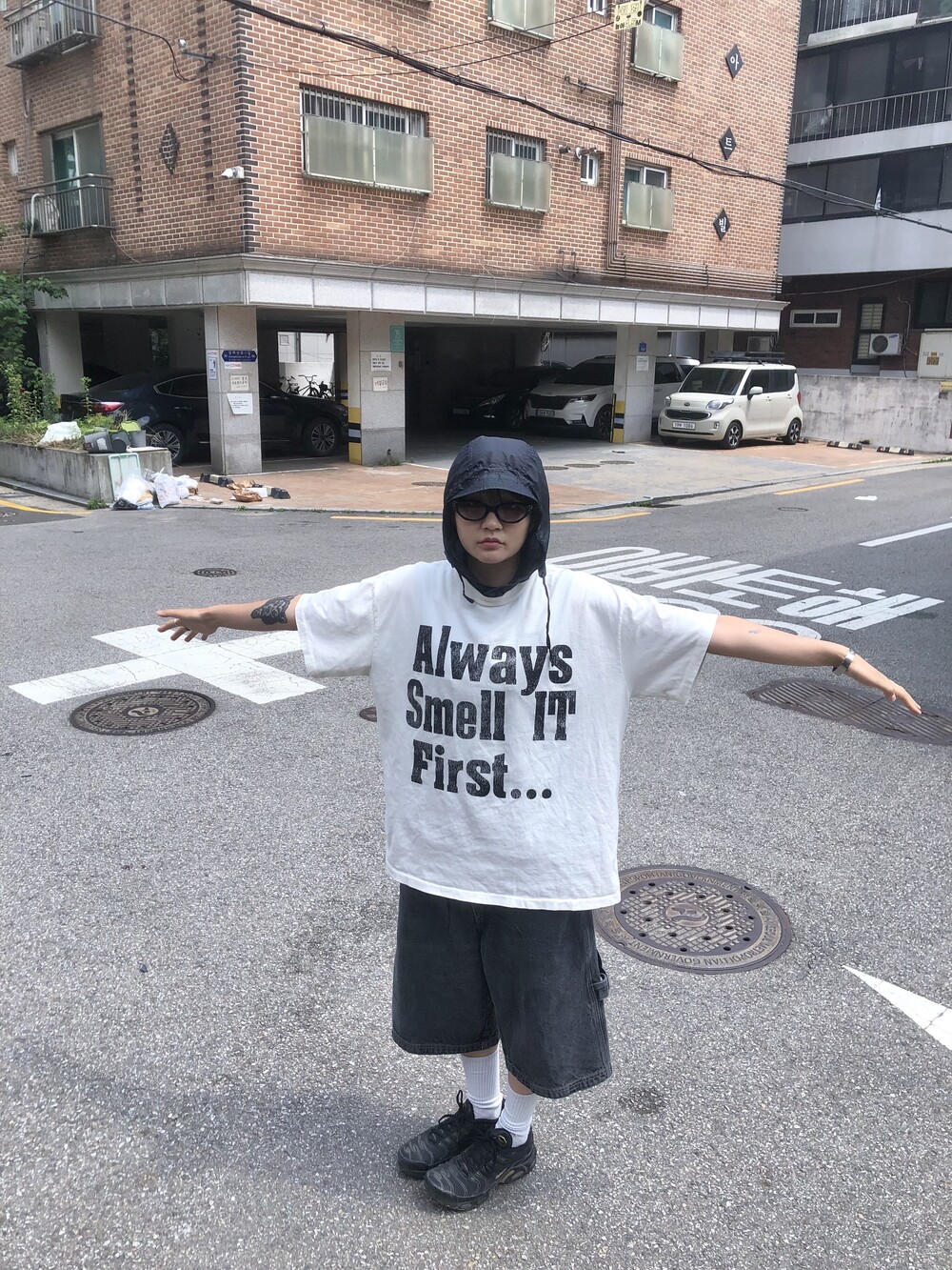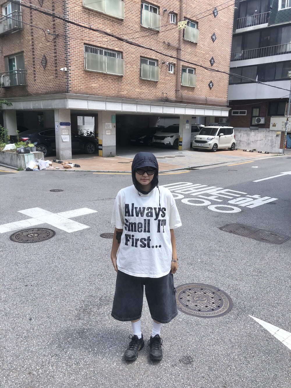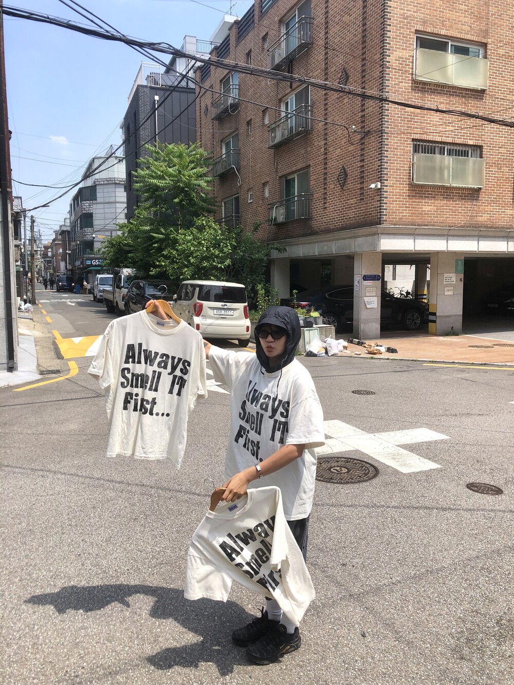 싱글스티치 처리(사진의 티셔츠는 샘플이라 더블이지만 완성본은 싱글스티치) 박시하고 짧뚱한 귀여운 핏의